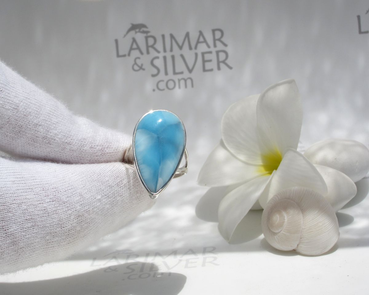 This iridescent sky blue pear shaped Larimar stone is 100% handmade, mirror polished and nicely set with eco-friendly (.925) recycled sterling silver to create gorgeous larimar ring…