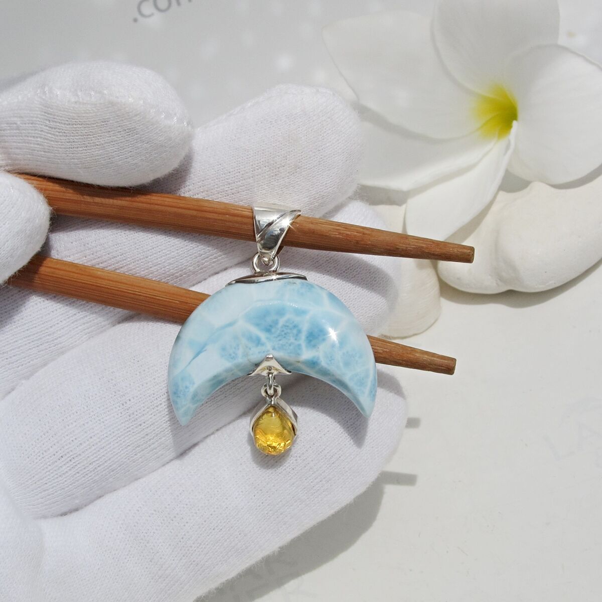 This eye catching larimar crescent pendant is 100% handmade; mirror polished, and nicely set with eco-friendly (.925) recycled sterling silver to create this powerful larimar pendant…