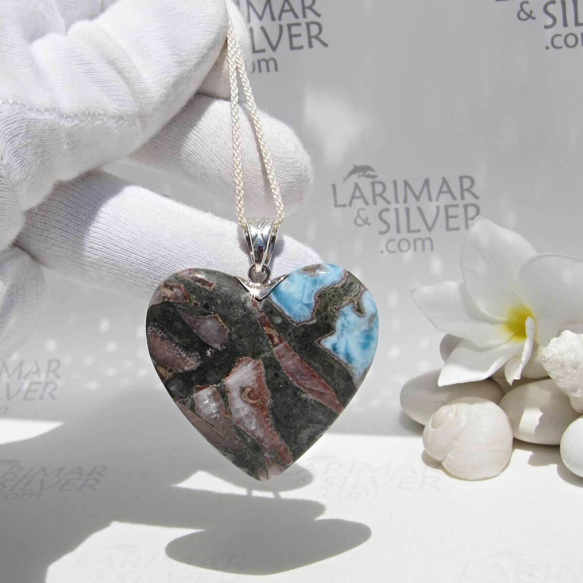This mysterious larimar heart pendant is 100% handmade; mirror polished, and nicely set with eco-friendly (.925) recycled sterling silver to create this “story telling” larimar pendant…